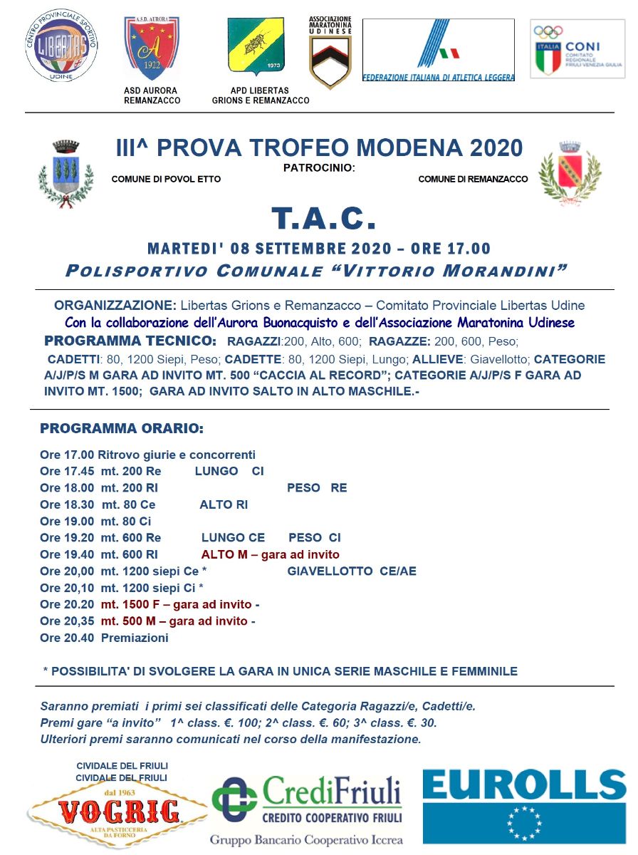 Rimandata a martedì 8 settembre la 3a prova del XX Trofeo Modena 2020, prevista per domenica 30 agosto. L'evento sarà organizzato dalla Libertas Grions e Remanzacco, in collaborazione con il Centro Provinciale Sportivo Libertas Udine, Aurora Buonacquisto e Maratonina Udinese sempre a Remanzacco presso il Polisportivo Comunale “Vittorio Morandini”. Il Test di Allenamento Certificato è patrocinato dal comune di Povoletto e di Remanzacco.