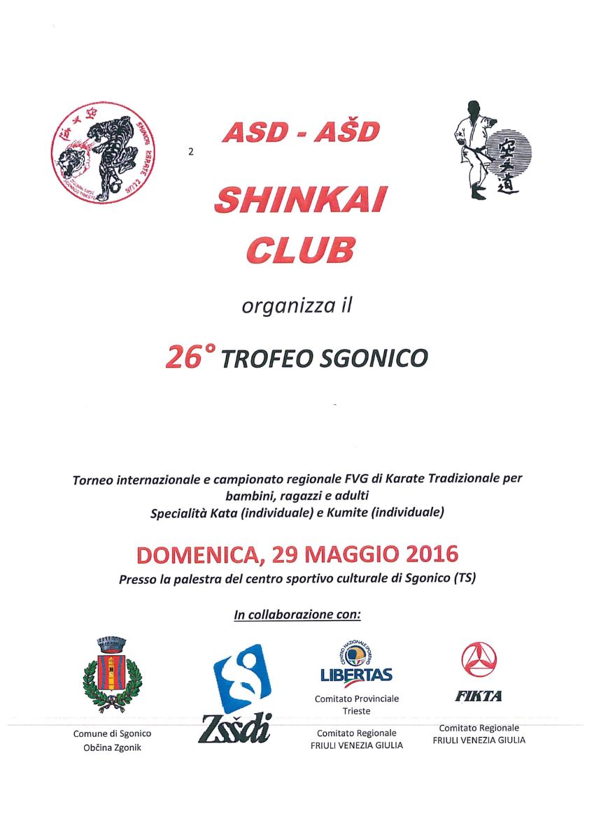 Trieste, 7.4.2016 - Lo Shinkai Club organizza il 29 maggio il 26.mo Trofeo Internazionale e campionato regionale FVG di Karate Tradizionale per bambini, ragazzi e adulti. Le specialità saranno Kata individuale e Kumite individuale.