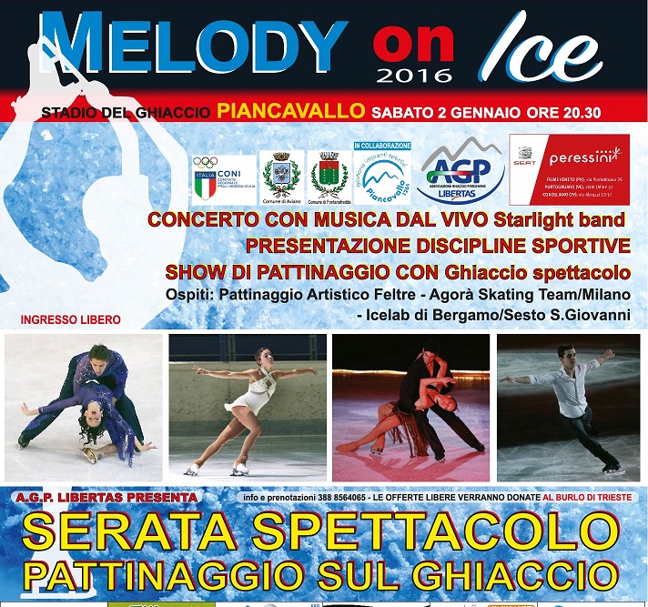 PORDENONE - Dopo la prima fortunata edizione dello scorso anno che registrò il tutto esaurito, lo stadio del ghiaccio in Piancavallo (o PalaPredieri con oltre 700 posti a sedere) si appresta a ospitare lo spettacolo "Melody on ice", in programma sabato 2 gennaio, inizio ore 20e30, ingresso libero. Organizzatori dell'evento sono la locale Cooperativa 1265 e l'Associazione Ghiaccio Pordenone Libertas, che per l'occasione presenterà le proprie discipline sportive (spaziano dal pattinaggio artistico all'hockey), cui si affiancheranno ospiti provenienti dai club di Feltre, Milano e Bergamo. Ma il clou della serata sarà ancora una volta il conclusivo show di alto livello, messo in pista dai performer della compagnia Ghiaccio Spettacolo, team composto da professionisti che hanno fatto parte della Nazionale di pattinaggio artistico. Il tutto sarà allietato dalle note dal vivo della Starlight Band di Fontanafredda. Al termine dello spettacolo, il pubblico assiepato sugli spalti sarà invitato a scendere in pista per pattinare a suon di musica. Nel corso della serata saranno raccolte offerte da devolvere all'istituto pediatrico Burlo Garofalo di Trieste. La Agp Libertas offre corsi di pattinaggio per bambini e adulti (avviamento e progressione), oltre a hockey amatoriale.