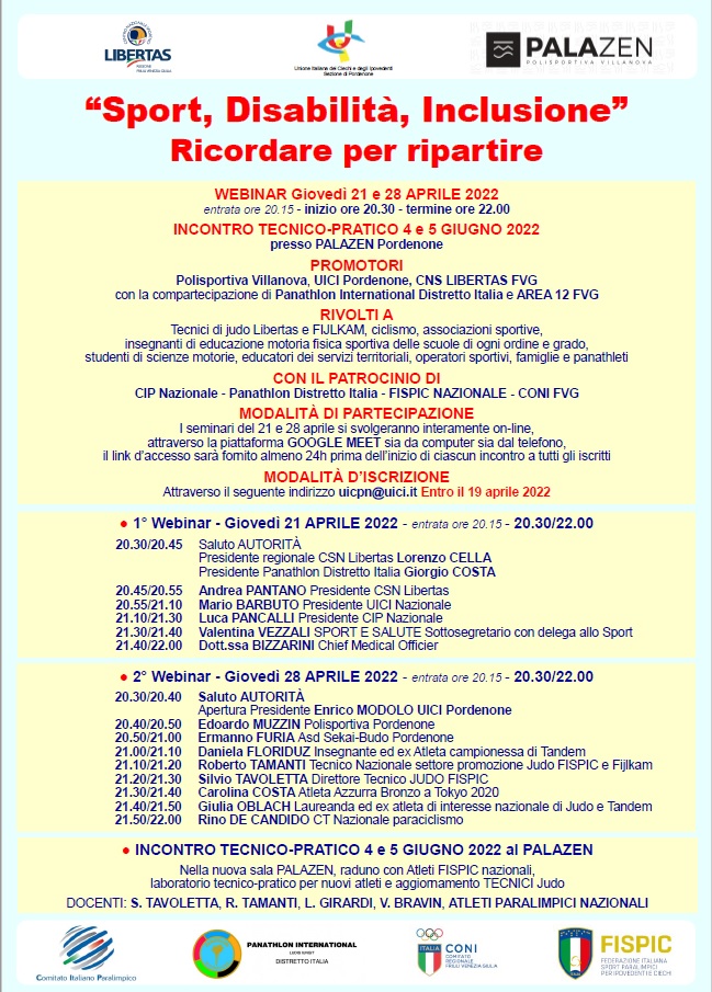 Ispirare nuove realtà sportive a sviluppare lo sport paralimpico e incoraggiare giovani e adulti ciechi, ipovedenti e con altre disabilità a riavvicinarsi all’attività sportiva dopo questo tormentato biennio pandemico che ha causato un diffuso scoraggiamento e abbandono della pratica sportiva. Questi gli obiettivi che la Libertas FVG si propone attraverso il ciclo di incontri “Sport, disabilità, inclusione. Ricordare per ripartire”, rivolto a tecnici, associazioni sportive, insegnanti e studenti di scienze motorie, educatori e operatori sportivi, famiglie e panathleti, organizzato in collaborazione con la sezione di Pordenone dell’Unione Italiana dei Ciechi e degli Ipovedenti, il Panathlon International Distretto Italia e Area 12 FVG, e la Polisportiva Villanova, nonché patrocinato da CIP Nazionale, Panathlon Distretto Italia, FISPIC Nazionale, Coni FVG.