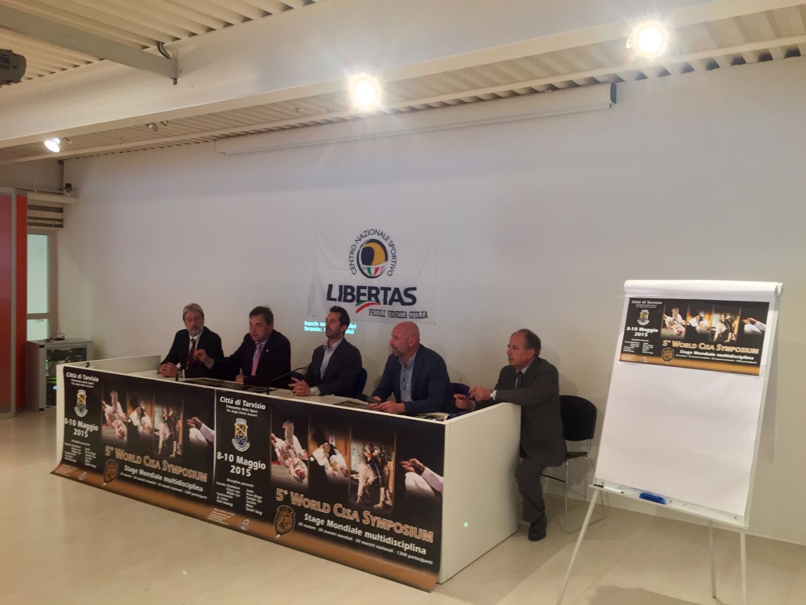 Torreano di Martignacco (Udine), 2.5.2015 - I fatti di Milano e lo sport come fattore di crescita culturale e di educazione e quale catalizzatore e portatore di valori sono stati una sorta di filo conduttore della presentazione della quinta edizione del World Simposyum che si svolgerà a Tarvisio (Udine) nella prossima fine settimana e che porterà nel centro alpino dei tre confini oltre mille persone, tra maestri, allievi e appassionati di arti marziali da tutto il mondo. La manifestazione, organizzata dalla Asd Nuova Cisa (Centro Italiano Sicurezza Autodifesa), affiliato Libertas, è stata presentata stamane nella sala Multiseum di Città Fiera dai vertici della stessa Associazione: il presidente Roberto Veronese ed il presidente onorario Andrea Cainero, dall'ideatore Marco Cavalli e dai responsabili di alcune delle scuole di arti marziali rappresentate, oltre che dal presidente della Libertas Bernardino Ceccarelli e dal sindaco e dall'assessore al turismo di Tarvisio, Renato Carlantoni e Igino Cimenti, presenti tra gli altri il presidente provinciale del Coni, Silvano Parpinel, ed il presidente dell'Ussi regionale Piero Micoli. La manifestazione tarvisiana avrà un prologo venerdì 8 maggio con uno stage privato dei corpi speciali francesi cui parteciperanno Carabinieri e Polizia. Il Raduno Mondiali di Arti Marziali, comprendente nella sua multidisciplinarietà le pratiche di autodifesa specialistiche per forze di Polizia e no, entrerà nel vivo sabato 9 maggio con la presenza nel Palasport di Tarvisio di 480 tra maestri e praticanti delle diverse discipline rappresentate, mentre domenica 10 maggio nel palazzetto ci saranno altri 580 atleti di Israele, Giappone, Marocco, Francia, Germania, Austria, Belgio, Slovenia e Croazia, oltre che naturalmente dall'Italia e per la prima volta dalla Svizzera, che si confronteranno nelle pratiche di Karate Shotokan, Goju Ryu, Wado Ryu, Taekwondo, Judo, Ju Jutsu, Krav Maga, MMA, Kich Boxing e Tai Chi.