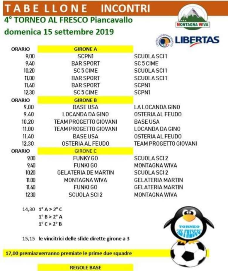 È giunta l’ora. Domenica 15 settembre si alza il sipario sul 1° Campionato Provinciale di Calcio a 5 Libertas, in occasione del 4° Torneo al Fresco organizzato da Montagna Wiva Libertas a Piancavallo, in località Col Alto – Roncjade, con la collaborazione del Centro Provinciale Libertas di Pordenone.