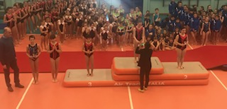 Di seguito iniziammo ad esibirci prima in trave, poi in trampolino, infine in corpo libero. Dovemmo aspettare molto tempo prima delle premiazioni. Mentre eravamo in fila e la signora stava premiando le assolute della nostra categoria chiamò la quinta, la quarta, la terza, la seconda.