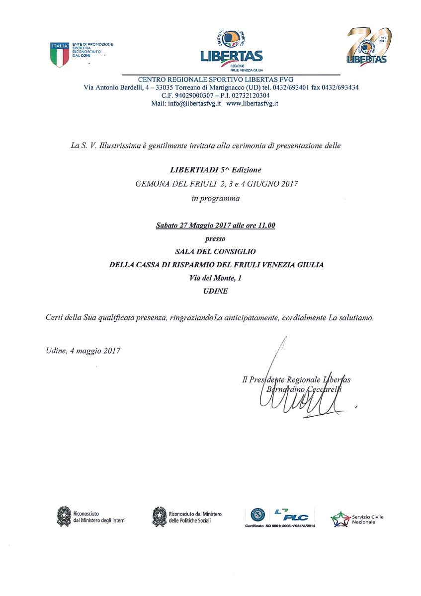 La cerimonia di presentazione delle Libertiadi 2017 si terrà sabato 27 maggio alle ore 11.00, nella pregiata sala del consiglio della Cassa di Risparmio del Friuli Venezia Giulia, in Via del Monte 1 a Udine.