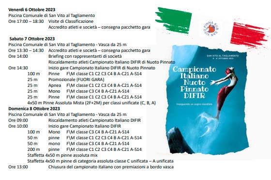Si parte con il Campionato italiano paralimpico di nuoto pinnato, organizzato da Asd Pinna Sub Libertas San Vito al Tagliamento, dal 6 all’8 ottobre, nella piscina comunale di via dello Sport; si prosegue, nel pomeriggio di domenica 8 ottobre, al termine della tregiorni di nuoto pinnato, con le Libertiadi di nuoto, una vera e propria vetrina per i tantissimi atleti che si misureranno nelle diverse discipline acquatiche, quali nuoto, nuoto pinnato, apnea e subacquea; ultimo appuntamento, il primo Campionato mondiale di Parafinswimming che si terrà a Lignano Sabbiadoro, dal 16 al 20 novembre, nelle strutture del Bella Italia EFA Village.