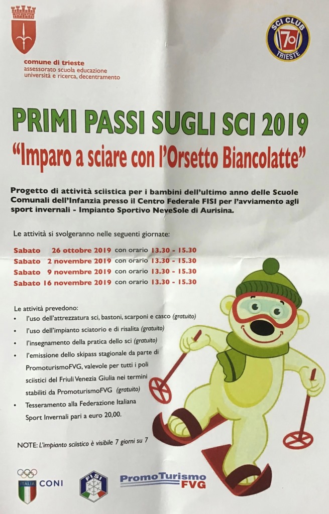 Lunedì 9 settembre, nella Sala Giunta del Comune di Trieste, l'assessore all'educazione Angela Brandi ha presentato il progetto “Primi Passi Sugli Sci 2019”. L'iniziativa, che vede la collaborazione dello Sci Club 70 e della Scuola sci di Aurisina, coinvolgerà circa 150 bambini dell'ultimo anno, provenienti dai 29 asili comunali cittadini. E' il terzo anno che sosteniamo e promuoviamo questo progetto, ha spiegato l'assessore, con l'intento di sensibilizzare i bambini e le famiglie nell'avvicinamento allo sport. L'attività fisica ed una vita sana, sin dall’infanzia, sono molto importanti per la crescita dei nostri figli. Dopo il successo delle passate edizioni e l'ottimo rapporto di collaborazione con lo Sci Club 70, ha proseguito la Brandi, ci sembrava logico confermare il nostro impegno anche quest'anno, ricordando che le attività, presso il centro federale FISI – impianto sportivo NEVESOLE di Aurisina, saranno totalmente gratuite.
