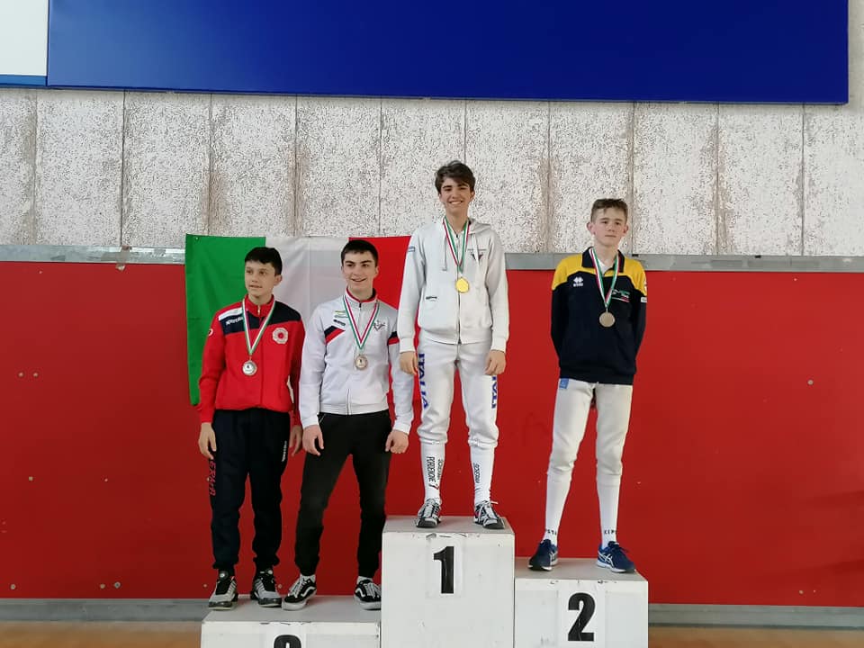 Fa il pieno di medaglie d’oro Marco Pellis, che primeggia nella Spada Cadetti, nel Fioretto Assoluti e nel Fioretto Cadetti.