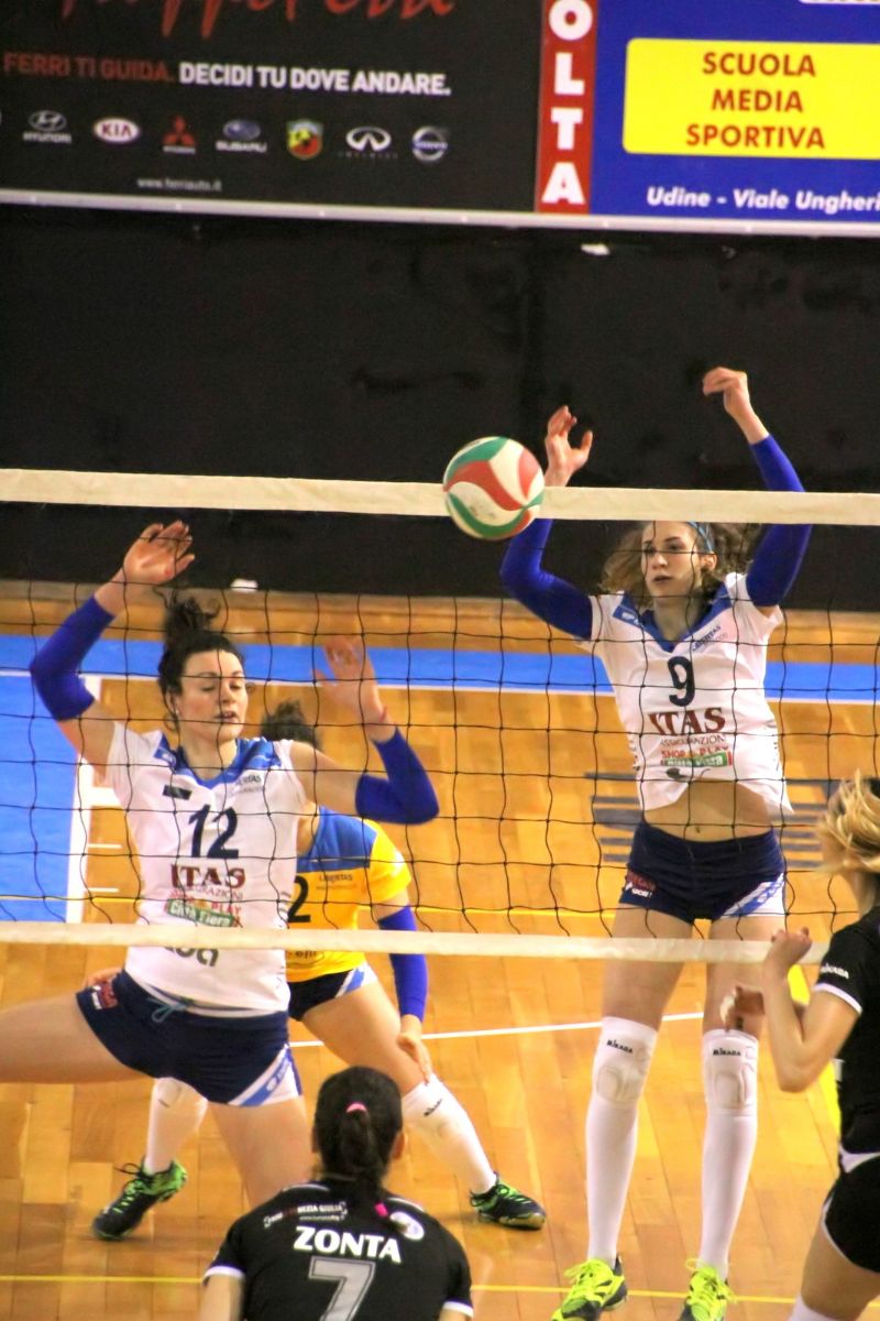 Udine, 5.3.2017 - L'Itas Città Fiera a ranghi ridotti, pur dopo una grande rimonta, cede per 3-2 (26-24, 25-21, 20-25, 18-25, 17-15) nel derby con l'Atomat Volley Udine e non riesce a ripetere il successo dell'andata, ma esce comunque a testa alta dal Palazzetto Manlio Benedetti dopo 2 ore e 8 minuti di battaglia e rimane quarta in classifica salendo a 34 punti.
