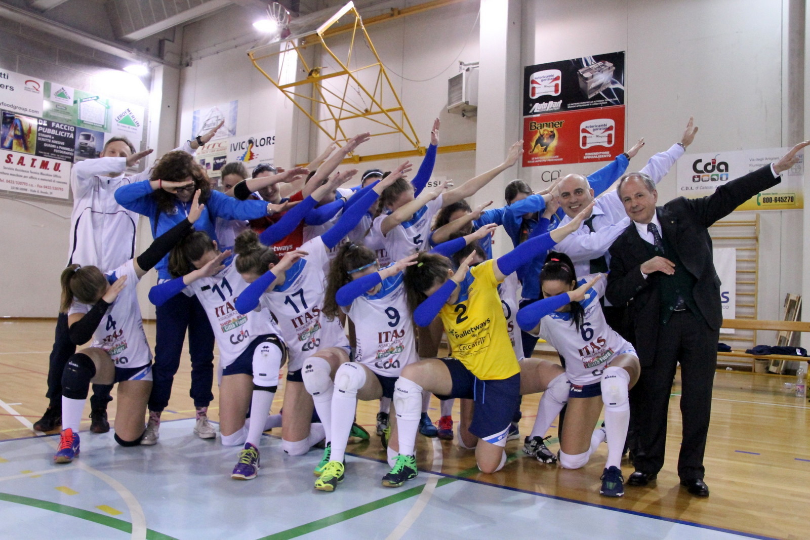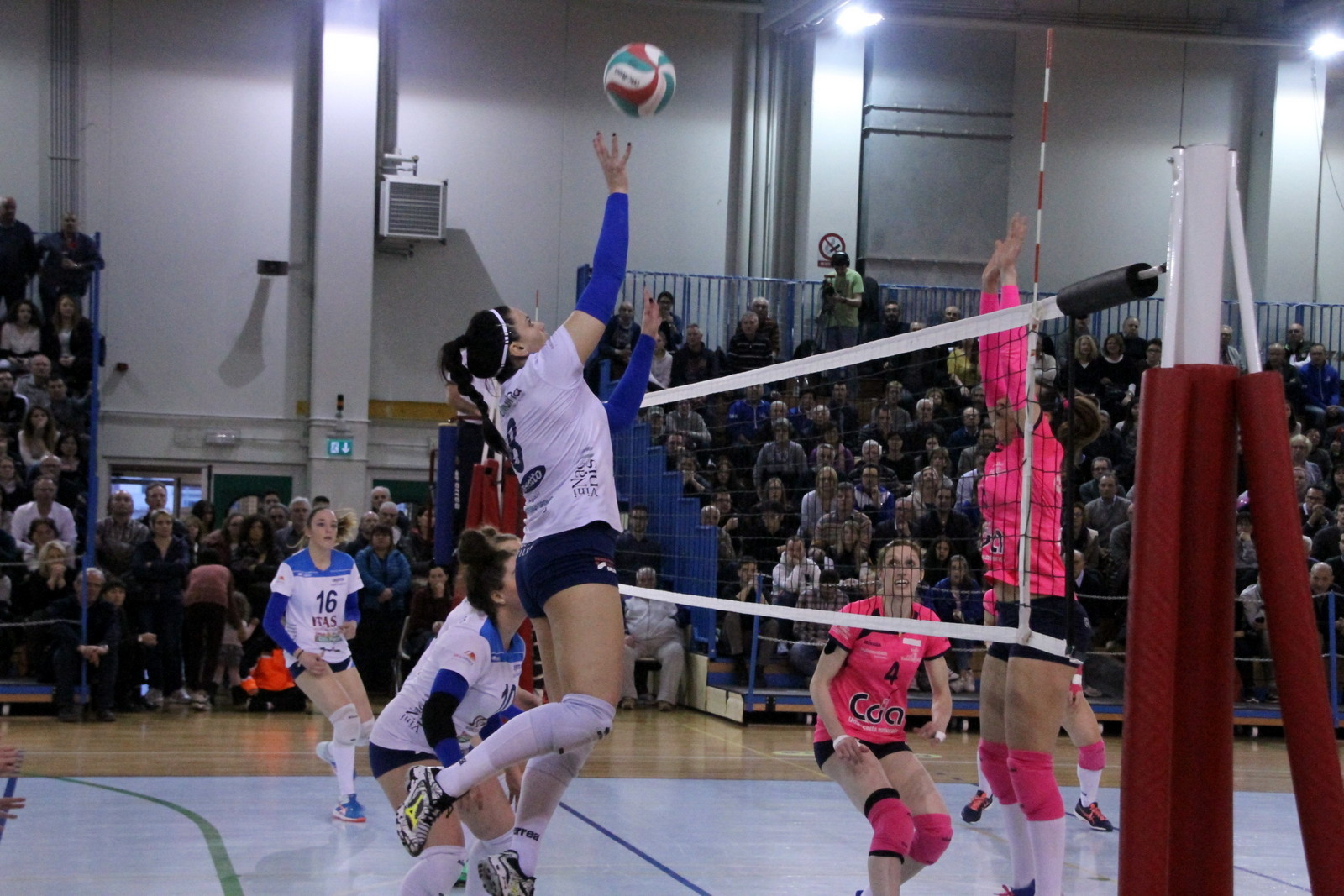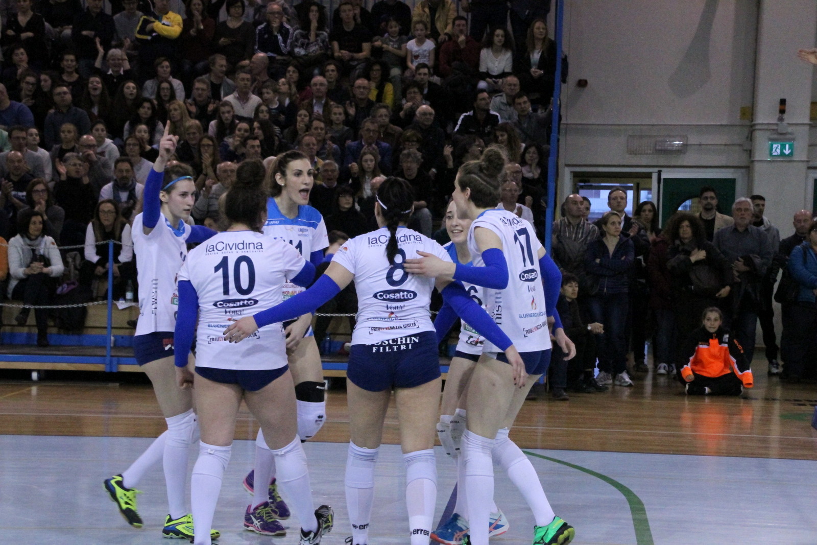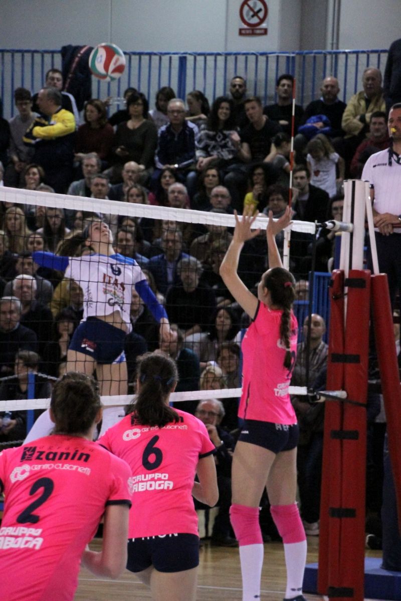 Martignacco (Udine), 26.3.2017 - Un'eroica Itas Città Fiera sempre in formazione d'emergenza ha battuto questa sera nel Palazzetto Atleti Azzurri d'Italia di Martignacco, gremito all'inverosimile, la terza in classifica CDA Talmassons per 3-1 (21-25, 25-23, 25-23, 28-26), facendo proprio in 123 minuti il derby del Friuli e consolidando la propria quarta posizione in graduatoria dove ora è salita a 40 punti.