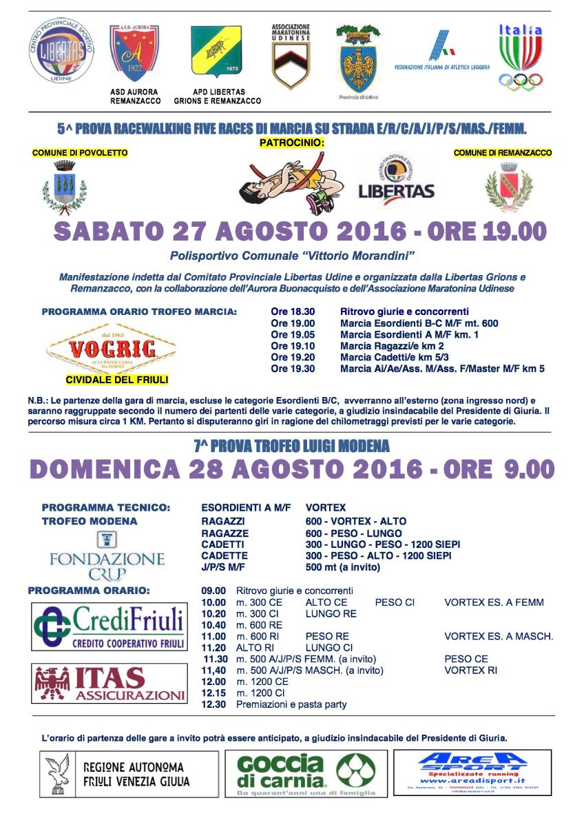 Si terrà a Remanzacco domenica 28 agosto la 7a prova del Trofeo Luigi Modena. Il giorno prima invece, sempre a Remanzacco, appuntamento con la 5a prova Racewalking Five Races di marcia su strada.