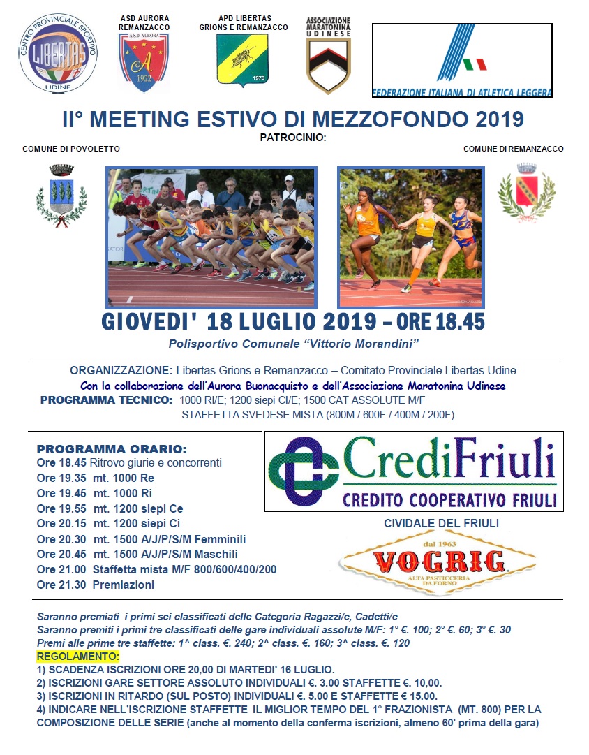 La Libertas Grions e Remanzacco, con il sostegno del Comitato Provinciale Libertas di Udine, organizza giovedì 18 luglio presso il Polisportivo Comunale “Vittorio Morandini di Remanzacco, il II Meeting Estivo di Mezzofondo 2019, con il patrocinio dei comuni di Povoletto e Remanzacco, e la collaborazione dell’Associazione Maratonina Udinese, l’ASD Aurora Remanzacco e la FIDAL FVG.