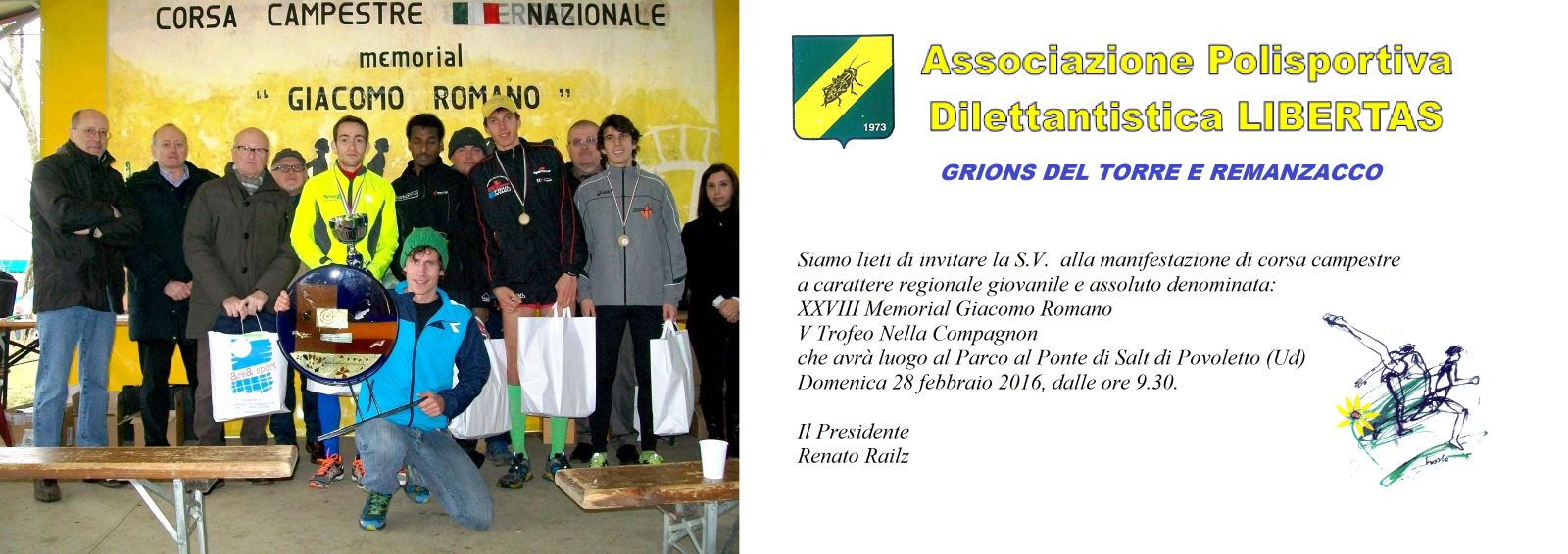 Povoletto (Udine)15.2.2016 - Il Memorial Giacomo Romano si appresta a compiere 28 anni e lo farà domenica 28 febbraio in una sede perfetta per questo tipo di competizioni. Il Parco al Ponte di Salt del Torre, per la seconda volta, sarà il campo di gara del cross patrocinato dai comuni di Povoletto e Remanzacco con la collaborazione della Regione Friuli Venezia Giulia, della Provincia di Udine e della Fondazione Crup e organizzato dalla Libertas Grions e Remanzacco e dalla Maratonina Udinese.
