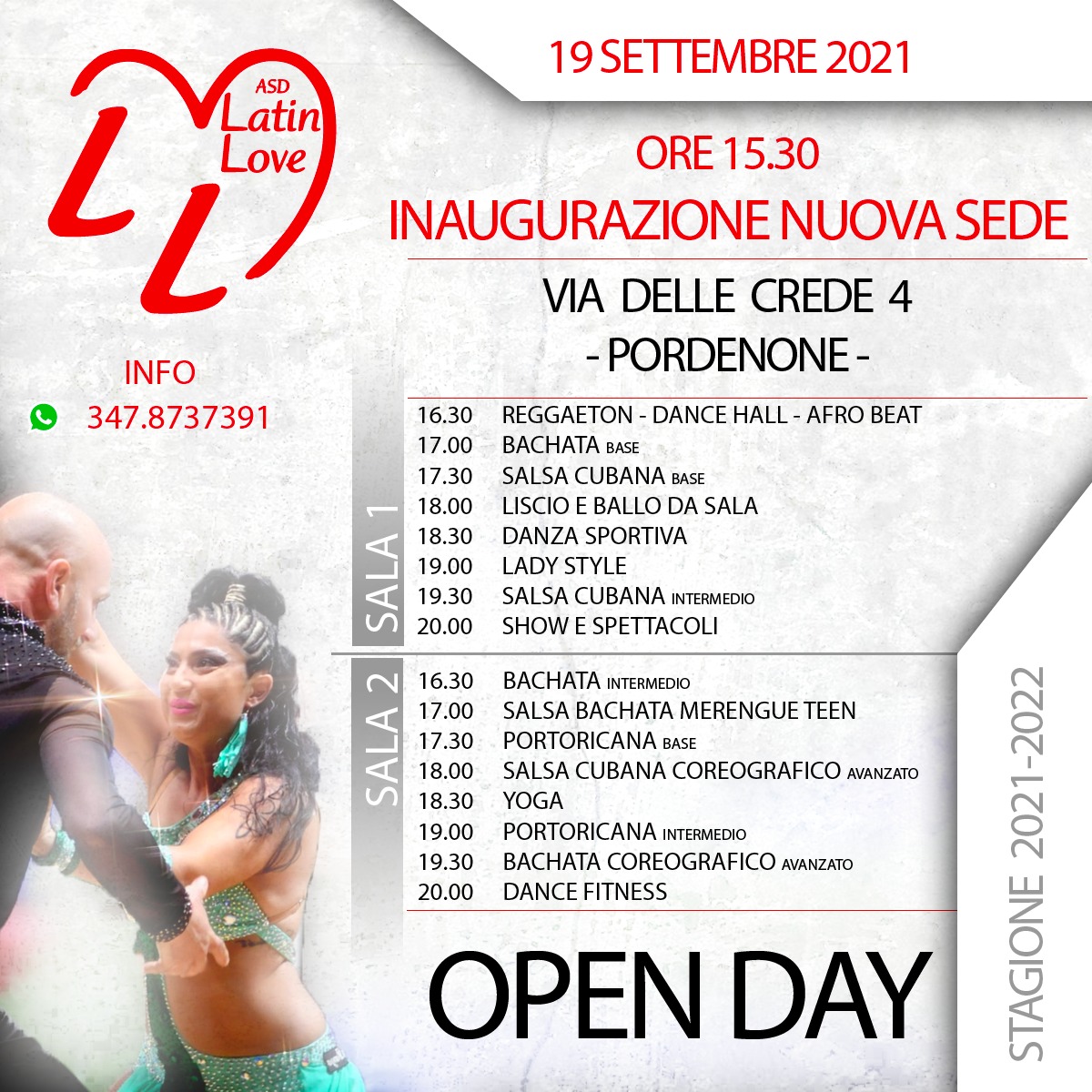 La voglia di ballare resiste a tutto, e dopo un lungo periodo di stop diventa ancora più travolgente. È proprio questo lo spirito della Latin Love Libertas che riprende a pieno ritmo le attività, e lo fa in grande stile. Domenica 19 settembre alle ore 15.30 inaugura infatti la nuova sede in via Delle Crede 4 a Pordenone, con un Open Day dedicato a tutti gli appassionati di balli caraibici.