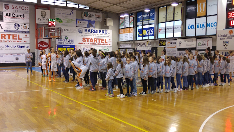Questa sera il PalaBenedetti si è dipinto di grigio perché sugli spalti erano presenti tutte le formazioni giovanili che compongono il vivaio della Libertas Basket School; durante l’intervallo il numeroso pubblico presente ha potuto conoscere ogni singola atleta della società.