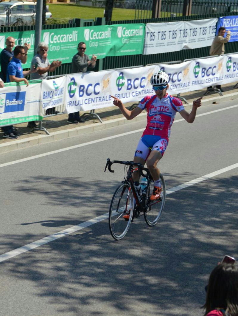 Udine, 11.5.2016 - "Riuscitissima da ogni punto di vista la 32' edizione della Festa della mamma gara in linea per la categoria allievi organizzata dalla Libertas Cersetto. 106 gli atleti che hanno preso il via dei 124 iscritti, provenienti dal vicino Veneto, Slovenia e Croazia oltre ovviamente tutto i friulani. In palio oltre ai premi in oro per le mamme (collier in oro alle mamme dei primi tre classificati) anche la maglia di campione regionale del Friuli Venezia Giulia. La gara di anima con dall'inizio sotto la spinta degli atleti di casa e della vicina Slovenia, ma i primi due TV, rispettivamente a Bressa ed a Mereto di Tomba, sono appannaggio di Leonardo Pasqual del G.C. Pasiano e di Federico Ceolin del Team Velociraptor. Lasciata la pianura ed iniziate le prime salite delle colline moreniche, la gara si anima ed il gruppo comincia ad allungarsi. Alla prima scalata a Moruzzo è Gioele Polano della Libertas Ceresetto a rompere gli indugi ed a scollinare per primo vincendo il GPM. Ma in discesa prima un paio di atleti e poi un gruppetto di una quarantina reagisce riportandosi sul fuggitivo. Suono della campana: a 9 km dall'arrivo dopo il primo gruppo transitano con poco distacco altri gruppetti di ritardatari. In testa comincia il controllo tra i pretendenti alla vittoria e mentre da dietro qualcuno rientra parte forte Gino De Vecchi dell'UC Conscio Pedale del Sile. Sembra l'azione giusta; De Vecchi inizia l'ultima salita con 20 secondo di vantaggio, ma è proprio sull'erta di Moruzzo che Polano esce dal gruppo e con una progressione impressionante salta De Vecchi scollina da solo e si butta a capofitto in discesa e si presenta sul rettilineo di arrivo con una manciata di secondi che gli permettono di tagliare a braccia alzate il traguardo e di indossare la maglia di campione regionale allievi strada 2016, maglia fatta indossare dal presidente regionale FCI Bruno Battistella. Ottima l'organizzazione. La manifestazione è stata sponsorizzata dalle BCC di Basiliano, del Friuli Centrale di Martignacco e di Udine.
