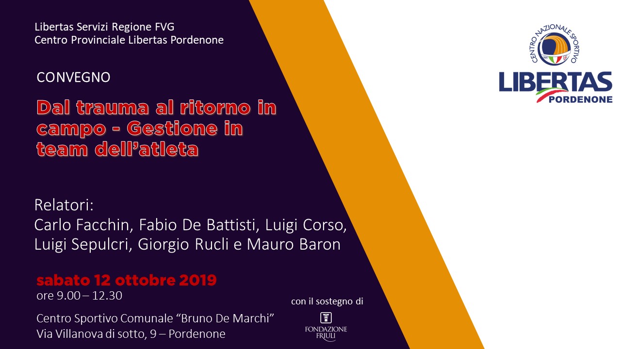 Prosegue la formazione di alta qualità in casa Libertas. Il Centro Regionale FVG e Provinciale di Pordenone, con il sostegno di Fondazione Friuli ed il benestare della Libertas Servizi FVG, organizza infatti il convegno “Dal trauma al ritorno in campo – gestione in team dell’atleta”. L’evento interesserà tecnici, allenatori, maestri, dirigenti e atleti; si terrà sabato 12 ottobre 2019 a partire dalle ore 9,00 presso il Centro Sportivo Comunale “Bruno De Marchi” Via Villanova di sotto, 9 a Pordenone.
