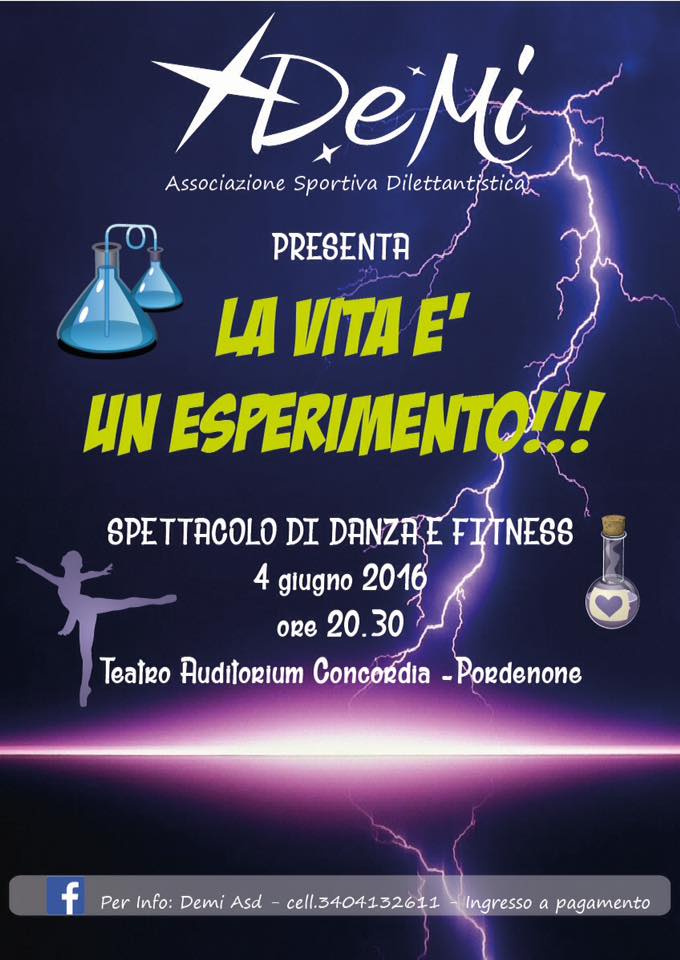 Veniamo al mondo senza libretto di istruzioni e per capire come riuscire a barcamenarci nell’ambiente che ci circonda non resta altra scelta che sperimentare. Questo il tema de “La Vita è un esperimento”, lo spettacolo di danza moderna e fitness organizzato dall’ASD Demi che si terrà sabato 4 giugno 2016 alle ore 30.30 presso il Teatro Auditorium Concordia a Pordenone.