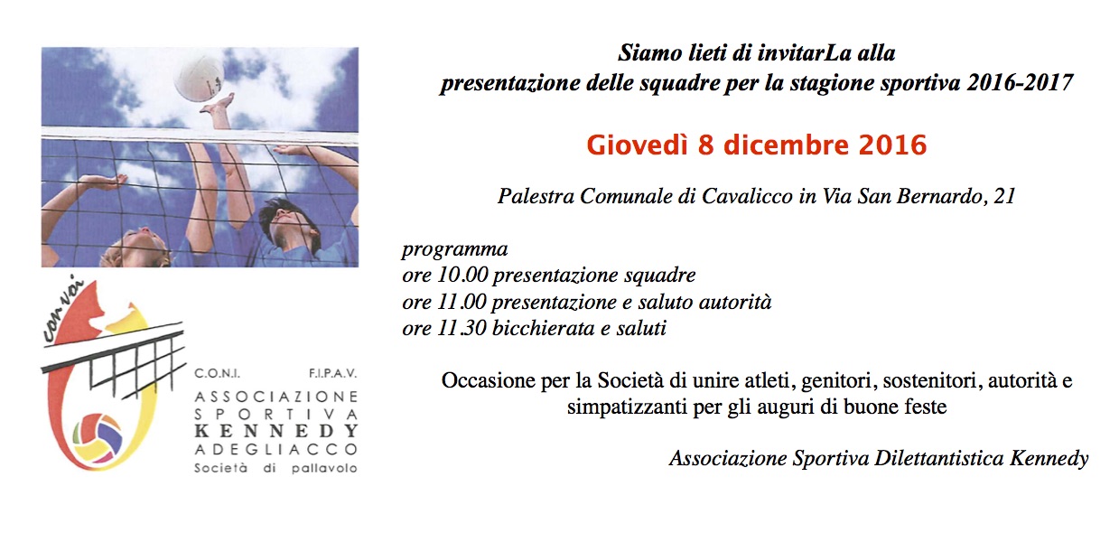Adegliacco (Udine), 6.12.2016 - L'Associazione Sportiva Kennedy di Adegliacco, affiliata Libertas, presenterà la mattina di giovedì 8 dicembre le sue squadre impegnate nei campionati della stagione sportiva 2016-2017. La festa di presentazione si svolgerà nella palestra comunale di Cavalicco, in via San Bernardo 21, con inizio alle ore 10. La Società di pallavolo Kennedy di Adegliacco, presieduta da Maurizio Casco, conta 120 tesserati, con formazioni che vanno dal minivolley alla serie D ed il prossimo anno festeggerà il mezzo secolo di vita. Nella tarda mattinata, dopo la presentazione delle squadre ed il saluto delle autorità, ci sarà un momento conviviale che riunirà atleti, familiari e amici sostenitori per gli auguri di buone feste.