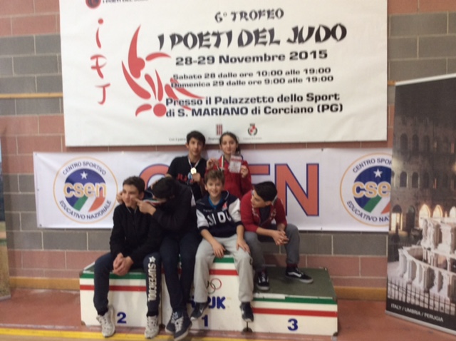 Pordenone, 11.12.2015 - Fruttuosa trasferta delle società "gemellate" Libertas Villanova Pordenone e Judo Vittorio Veneto che, confermando la decennale mutua collaborazione, si sono recate a San Mariano di Corciano (Perugia) per il Trofeo "I poeti del judo". Nella categoria Esordienti A, risultati di rilievo per Edoardo De Bettin (primo, portacolori del Vittorio Veneto), Alexandra Iordache (terza, Villanova), Mircea Maxim (terzo, Vittorio) e Alessandro Viva (quinto, Villanova). Ottime prestazioni anche negli Esordienti B con Martin Tomasella (primo, Vittorio) e Sebastiano Michelotti (quinto, Vittorio).