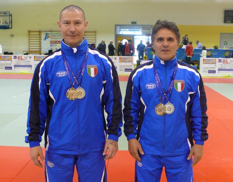 Reggio Emilia, 12.5.2015 - Massimo gradino del podio per gli atleti azzurri Marco Dotta e Marco Durigon, che al memorial Bisi di Reggio Emilia, valevole come quarta prova del Gran Prix nazionale di kata, hanno vinto l'ennesima medaglia d'oro nel Kodokan Goshin Jitsu, ovvero il kata della difesa personale moderna. Si tratta della conferma dell'ottimo livello raggiunto dalla coppia, che quest'anno si è aggiudicata tre prove su tre (Giaveno, Pordenone e Reggio). Una prova che è stata un test utile per il prossimo impegno che li vedrà impegnati ai campionati Europei a Herstal (Belgio) il 23 e 24 maggio. Diciannove coppie compongono la squadra azzurra che prenderà parte alla rassegna continentale. Tra di essi anche Michele Battorti (Villanova Pordenone) in tandem con il triestino Stefano Bucer (gareggeranno nel nage no kata over 34) e l'azzanese Marika Sato con Fabio Polo (kodokan goshin jutsu).
