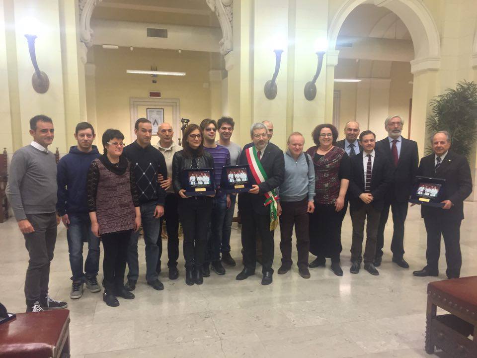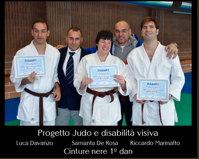 Udine, 11.2.2016 - Luca Davanzo, Samanta De Rosa e Riccardo Marinatto sono i primi tre non vedenti che con uno specifico programma dello Sport Team Judo Udine hanno ottenuto la Cintura nera I dan dopo un percorso durato sette anni e che questa sera sono stati in visita dal sindaco di Udine, Furio Honsell che, con l'assessore comunale allo sport, Raffaella Basana, e gli altri membri di giunta Pizza, Del Torre e Avanzi, li ha ricevuti a Palazzo d'Aronco, presenti i presidenti della società udinese che li ha formati, Luigi Girardi, e della Libertas regionale, cui la stessa è affiliata, Bernardino Ceccarelli. Le tre nuove Cinture nere - ha ricordato Girardi nell'incontro - hanno seguito dal 2009 lo specifico Progetto judo e disabilità visive: corso pilota per persone cieche e ipovedenti, che viene realizzato con la collaborazione della sezione provinciale di Udine dell'Unione Italiana Ciechi, del Comitato Italiano Paralimpico del Friuli Venezia Giulia del Centro Nazionale Sportivo Libertas. Girardi, che è cintura nera 6° dan ed è responsabile regionale del Comitato Regionale FVG Settore judo per l’attività sportiva con persone disabili, si avvale della collaborazione di istruttori altamente specializzati ed i corsi del team da lui presieduto si articolano il segmenti di nove mesi e sono ospitati due sere alla settimana nella palestra della scuola media udinese Ellero. Il progetto judo e disabilità visive, che gode anche della collaborazione dell’Ambulatorio di Medicina dello Sport per la persona disabile dell’Istituto di Medicina Fisica e Riabilitazione Gervasutta, di Udine, aveva avuto inizio con otto giovani ed ora, dopo Davanzo, Derosa e Marinatto, stanno per ottenere la Cintura nera I dan altri tre atleti. Il presidente della Libertas Regionale, Ceccarelli, ha affermato nell'occasione che "è ammirevole che una società come lo Sport Team Judo Udine, oltre a sviluppare un programma per avvicinare tanti giovani allo sport, riesca a impegnarsi, ed a così alto livello, anche per inserire i disabili; Ceccarelli ha poi sottolineato che la società udinese è l'unica nel settore che svolge un simile programma in provincia di Udine, mentre un'altra, sempre affiliata Libertas, lavora con i non vedenti è a Villanova di Pordenone. Si tratta di realtà - ha concluso Ceccarelli - che con il loro operato danno grande prestigio e orgoglio alla Libertas e che rappresentano al meglio lo spirito dell' Ente di promozione sportiva di lavorare per tutti e di avvicinare il maggiore numero possibile di persone allo sport, che è da sempre anche scuola di vita".