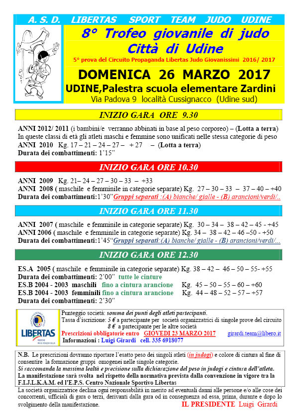 Torna a Udine l'appuntamento con il Judo giovanile, l'8° Trofeo Giovanile di Judo Città di Udine, organizzato dalla Liberta Sport Team Judo Udine, valido come 5a prova del Circuito Propaganda Libertas Judo Giovanissimi 2016/2017, che si svolgerà il 26 marzo 2017 nella palestra della scuola elementare Zardini, in via Padoca 9, località Cussignacco, Udine.
