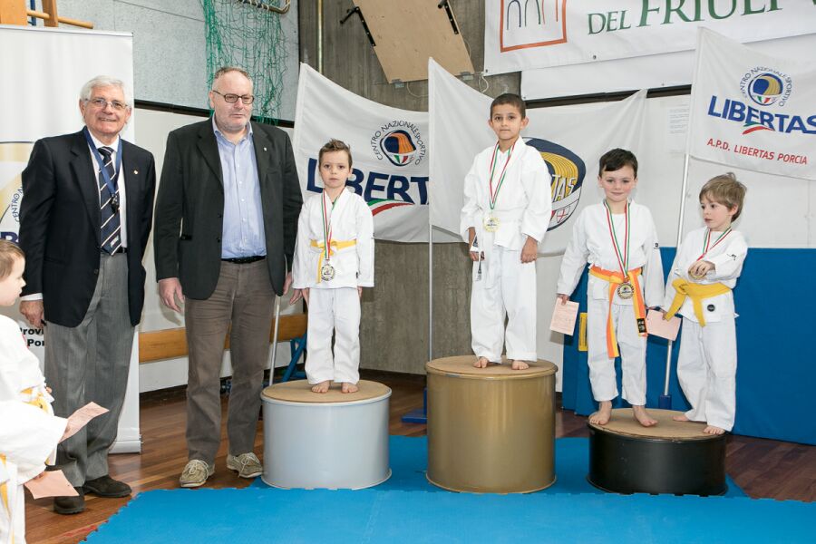 Porca (Pordenone), 26.3.2015 - La polisportiva Libertas Porcia ha celebrato quest'anno la 20esima edizione del Trofeo di karate, un traguardo per il quale si è voluto ripristinare anche le gare di kumite (combattimento) accanto alle classiche esibizioni di kata. Al PalaCornacchia di Porcia (spalti gremiti) sono affluiti 204 atleti in rappresentanza di 19 società con prevalenza di tesserati dal vicino Veneto, oltre che da tutta la regione friulana, mentre la giuria si è arricchita di due arbitri provenienti dalla Slovenia. Spettacolare la gara del kumite, dove gli atleti non si sono certo risparmiati, tanto che non è mancato il lavoro per i medici presenti. Alle premiazioni hanno presenziato Ivo Neri presidente provinciale Libertas, Edoardo Muzzin consigliere nazionale per le arti marziali, Martina Zanetti assessore comunale allo sport, Rudi Trost vicepresidente Libertas Porcia e Paolo Marostegan delegato regionale per il karate.