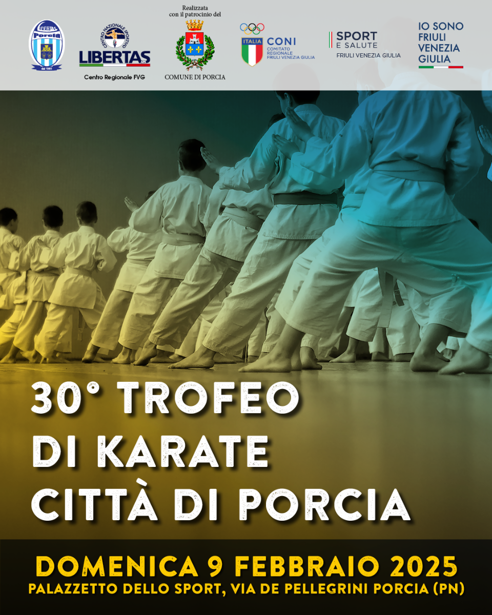Tutto pronto per il 30° Trofeo di Karate Città di Porcia e 23° Trofeo Provincia di Pordenone, organizzato da Apd Libertas Porcia con il supporto di Libertas Fvg e Libertas nazionale, Coni Fvg, Comune di Porcia. L’evento si svolgerà domenica 9 febbraio, dalle 9 in poi, nel Palazzetto dello Sport di via De Pellegrini, a Porcia.