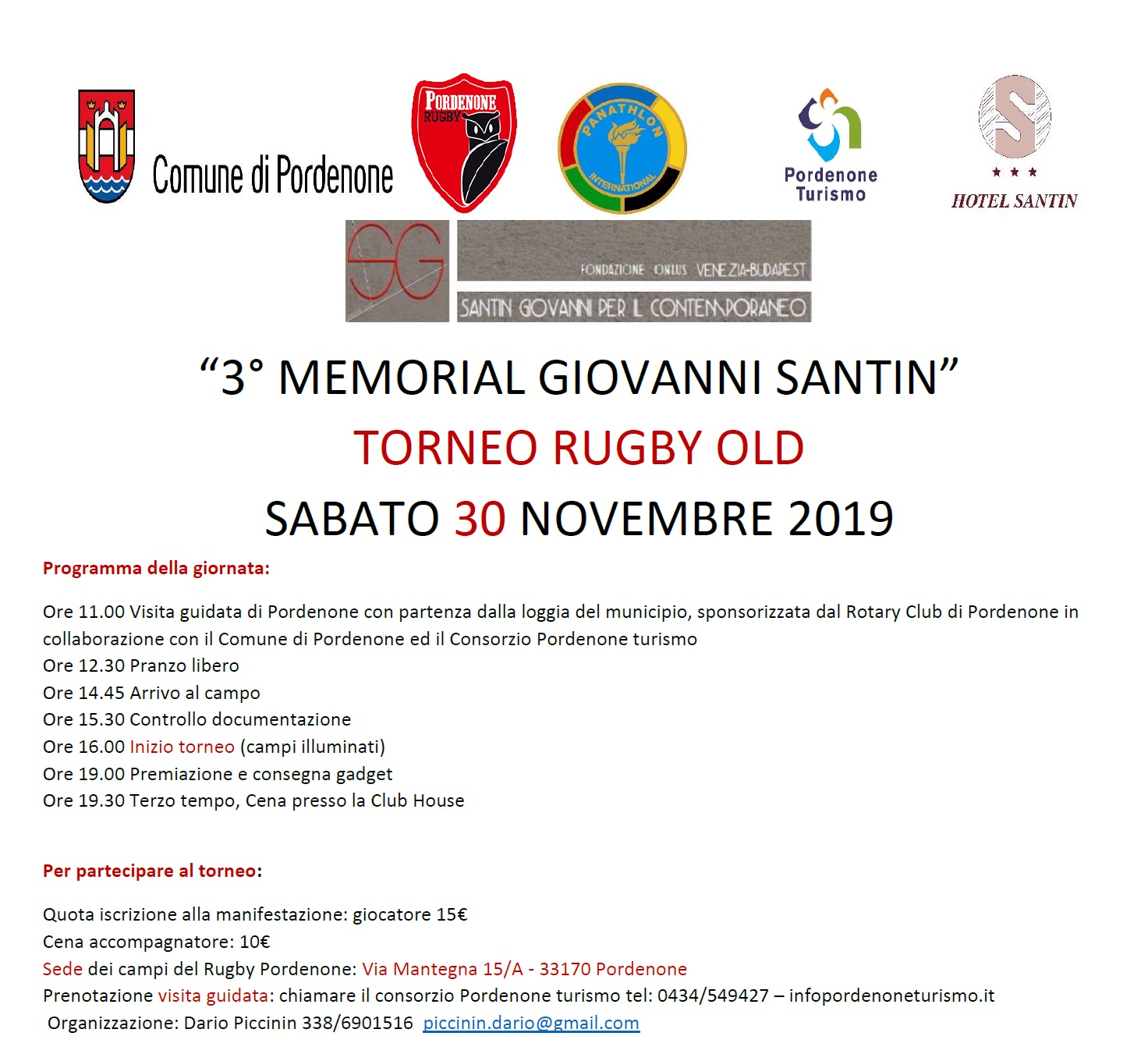 Il 30 novembre presso i campi del PORDENONE RUGBY di via Mantegna avrà luogo il Memorial Santin, il torneo degli old giunto alla sua terza edizione organizzato in ricordo del mecenate che per primo ha creduto nel progetto di Paolo Quirini di portare il rugby a Pordenone.