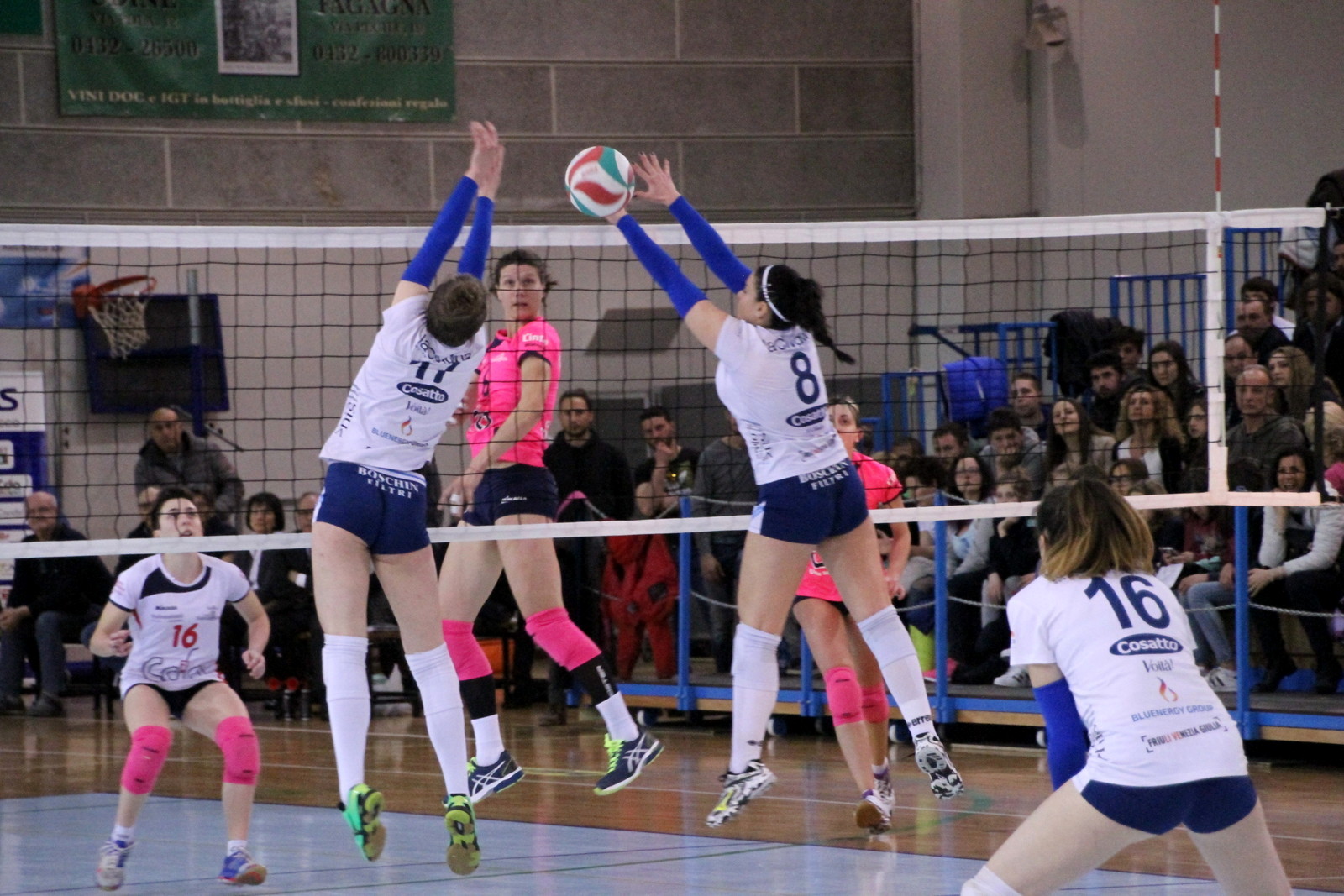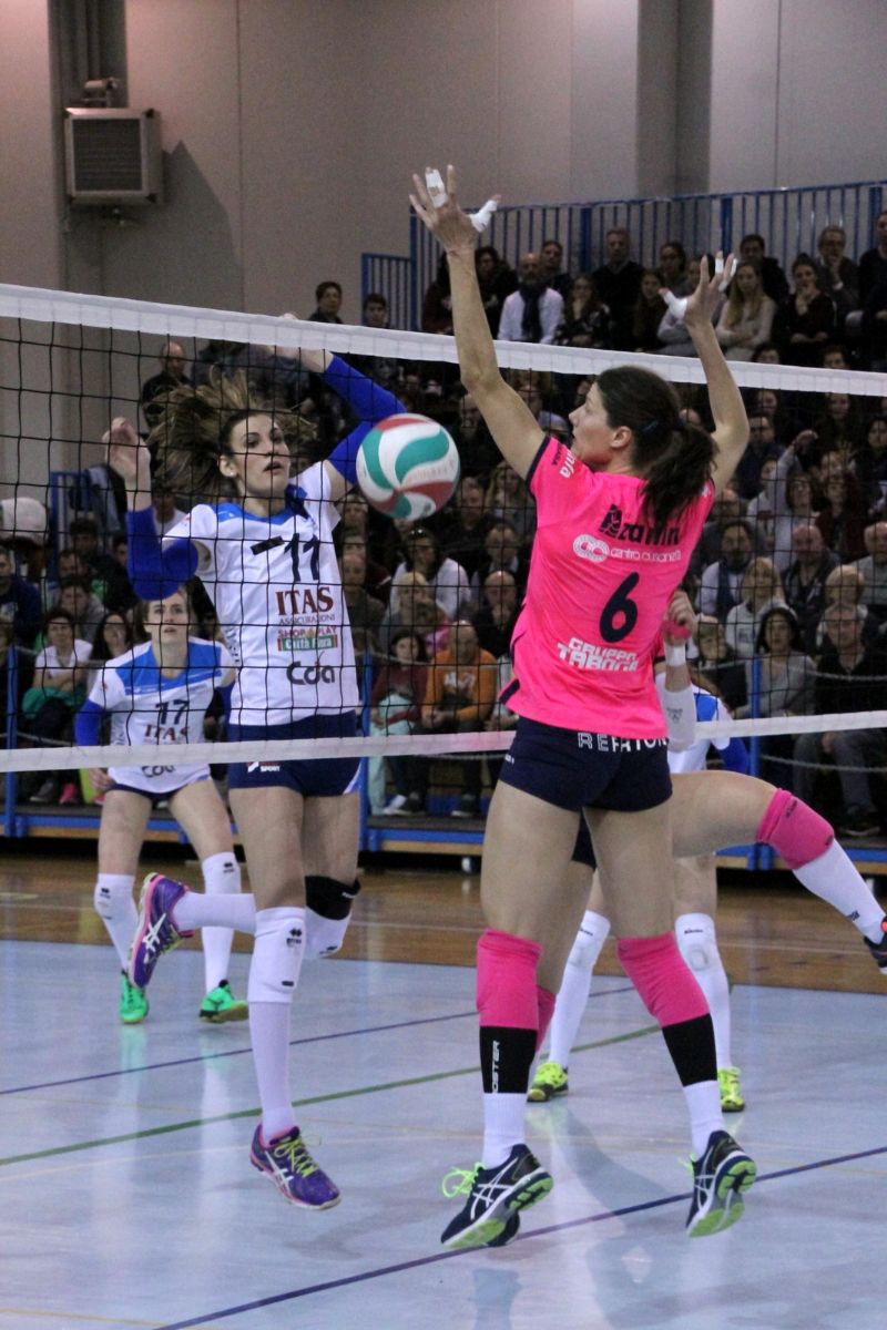 Martignacco (Udine), 26.3.2017 - Un'eroica Itas Città Fiera sempre in formazione d'emergenza ha battuto questa sera nel Palazzetto Atleti Azzurri d'Italia di Martignacco, gremito all'inverosimile, la terza in classifica CDA Talmassons per 3-1 (21-25, 25-23, 25-23, 28-26), facendo proprio in 123 minuti il derby del Friuli e consolidando la propria quarta posizione in graduatoria dove ora è salita a 40 punti.