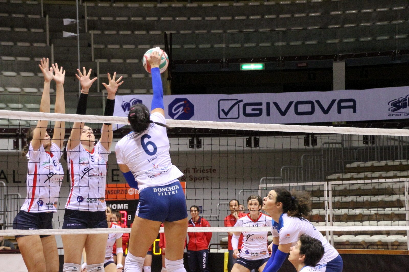 Trieste, 18.12.2016 - L'Itas Città Fiera Libertas Martignacco liquida con il punteggio 0-3 (19-25, 23-25, 15-25) la Simagas Trieste, fa proprio il doppio derby regionale e Libertas in 86 minuti, va a 18 punti in classifica salendo dal sesto al quarto posto e incassa all'istante il plauso del Presidente della Libertas Martignacco, Bernardino Ceccarelli, per quello che ha definito "il più bel regalo di Natale che la squadra potesse fare ai tifosi e alla Società". E numerosa e fragorosa è stata anche a Trieste la tifoseria al seguito che ha sostenuto la compagine di Martignacco e si è divertita, nel difficile PalaRubini che per le sue vaste dimensioni rende ardua l'individuazione dei riferimenti. "E' stata una vittoria netta - ha soggiunto il Presidente - in un incontro a tratti interessante e va riconosciuto che le cugine di Trieste hanno la panchina un po' corta e nonostante ciò si sono comportate e difese bene. Si tratta della seconda vittoria - ha sottolineato Ceccarelli - delle atlete allenate da Gazzotti e Zampis e speriamo che si possa ulteriormente concretizzare anche in futuro.