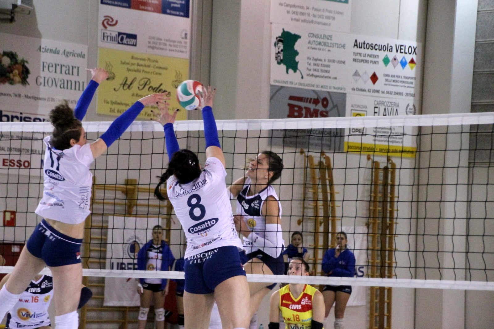 Martignacco (Udine), 12.3.2017- L'Itas Città Fiera si rifà con gli interessi del 3-1 dell'andata a Castel D'Azzano (Verona) e strapazza la Vivigas Arena Volley con un 3-0 (25-14, 25-16, 25-17) dai parziali che non lasciano equivoci e così, pur a ranghi ridotti, la squadra di Gazzotti e Zampis rafforza la sua quarta posizione in classifica salendo a 37 punti.