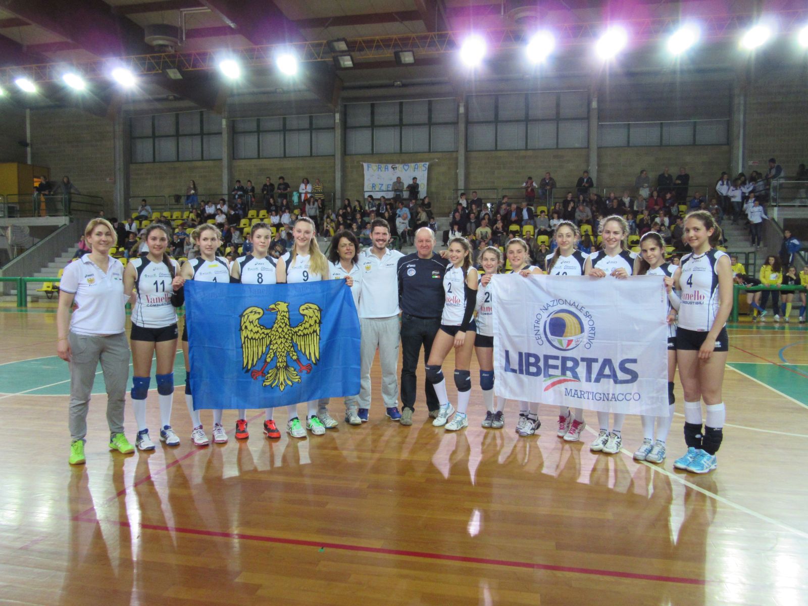 Martignacco (Udine), 6.5.2015 - Festa grande in casa della Polisportiva Libertas Martignacco per celebrare il titolo provinciale della sua squadra femminile Under14 Vanello Combustibili, che il I maggio ha conquistato il prestigioso risultato battendo con punteggio pieno sia il Rizzi Volley, sia la Sangiorgina. Nelle gare finali del campionato, disputate a San Giorgio di Nogaro (Udine), le piccole grandi promesse della Polisportiva Libertas Martignacco hanno in dettaglio fatto proprio il titolo di campione provinciale battendo in semifinale il Rizzi Volley per 3 a 0 (25-6, 25-16 e 25-15) e in finale la Pallavolo Sangiorgina sempre per 3 a 0 (25-18, 25-14 e 25-14). I netti risultati conseguiti dalla formidabile formazione allenata da Maria Delpin, con dirigente Emanuela Coccolo - ha rilevato la Società di Martignacco - confermano la forza e la costanza di queste atlete che non soltanto nelle finali, ma durante tutto l'arco della stagione hanno sempre battuto tutte le avversarie per 3-0. "La continuità di queste atlete - ha affermato lo stesso presidente della Libertas Martignacco Bernardino Ceccarelli, complimentandosi con la squadra e lo staff - addirittura non si limita a questo, in quanto la medesima compagine nella precedente stagione aveva egualmente conquistato il titolo provinciale nella categoria Under 13. Ciò - ha sottolineato il Presidente - dà a tutti noi, oltre ad una grande soddisfazione, la conferma della validità del lavoro svolto da ciascuno con grande impegno e costanza e la fiducia più che concreta nel nostro vivaio che, nell’ambito della Scuola federale di pallavolo, rappresenta la certezza in un futuro che vedrà proseguire la tradizione di successi della Polisportiva Libertas Martignacco".
